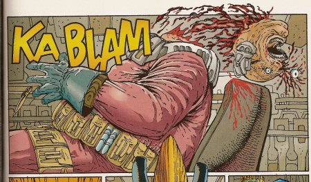 It's like when your friend decides he wants to write X-Files fan fiction, but instead of writing his own episodes of the X-Files they're all stories about Mulder and Scully hanging out with their new friend YOUR FRIEND. There is absolutely zero humor or creativity going into it, Liefeld just drew a goddamned Lobo comic, and because he goes LOOK GUYS IT'S LOBO I'M SELF AWARE it's supposed to excuse the fact that he's a lickshit with the artistic ability of 2 girls with 1 cup. In the big finale, Bloodwulf shoots the boss in the head one time (ka-blam) and manages enough force to sever the head completely from the body and still be accurate enough to pop out the guy's eyeball. Thank goodness Bloodwulf shot him in the neck hard enough to break the spine off a foot below impact and spill the body's supply of stringy goop. And look, even the fat guy is covered in pouches.