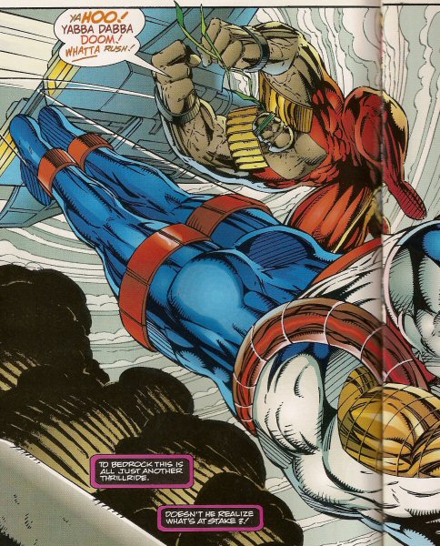 And I know that Liefeld (sadly) isn’t to blame for this, but what the fuck kind of introduction to someone and their power is “Tempo, who can make time fly with her.” So like, she flies, I guess? And something to do with controlling time? Ah the hell with it, we’ll make it up as we go.