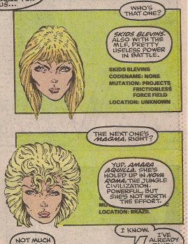 This is Skids Blevin and Magma. They used to be in the New Mutants, but now they're in the dreaded MILF. They look exactly the same. Can you tell which one is supposed to be Hispanic?