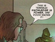 Doom, wrapped in webbing (since that's all that it took to defeat him), calls them "lamentable toads" (which gets a laugh out loud from me) and reveals that though they have destroyed his Brain Drain, they have still failed, for it has already accomplished its cherished goal. Doom now knows all about that one episode of Gilmore Girls and there's nothing you can do to stop him! Although he does admit they are a little too chatty.
