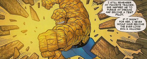 Don't you HATE being the Thing? Or even if you don't now, haven't you hated being a deformed outcast for forty years? When was the last time you wore a shirt? You should hate your teacher for inspiring you to fly out into space and get bombarded by cosmic rays, and eventually have your shit punched out by the Hulk. Remember when Wolverine jumped on your head and made your face look like a sea anemone? That wouldn't have happened if you'd been working a desk job somewhere.