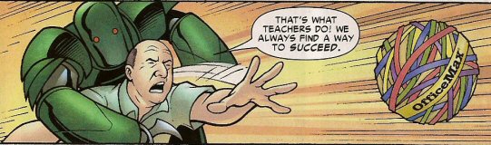 Teacher Hermann H. Hoffman ("The Cerebral Assassin") is the one who finally saves the day, using the only thing that could've possibly freed the heroes and brought peace to the leaders of tomorrow.