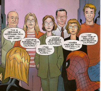 Finding 1 - Spider-Man being an iconographic representation of the possibilities of life for any child (regardless of creed, religion, or color) under the mask is shot to shit because Spider-Man no longer has a secret identity and everybody knows he's Peter Parker.