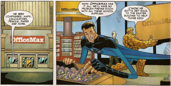 I like how the bald guy is all, "teachers don't usually stand on the sidelines, INVISIBLE WOMAN." He's got her number. "Teachers can't just turn invisible and hide from Annihilus, INVISIBLE WOMAN, he is the Living Death that Walks but if he has a smart mouth he is the Living Death that Stands Outside in the Hall." Tony "The P" Pavlovich (who you may remember from Jim Thome's hat) needs some supplies (teacher's manual, photocopied pieces of paper that he'll make them hand out so he doesn't have to) so they decide to head on over to their local OFFICEMAX BRAND DEALERY instead of using the apparent facilities or fairly intelligent astronauts in the futuristic skyscraper they are standing in.