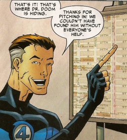 Theory 2: Reed already found Dr. Doom and didn't want to make the teachers feel like shit for not being able to help. This theory is supported by a panel where the Thing is showing the teachers the balls while Spider-Man hangs upside down reading a sheet of paper no doubt passed to him by Mr. Fantastic, reading, "LOL hey lets find Dr. Doom using Cliff's Notes for Jacob Have I Loved am i right"
