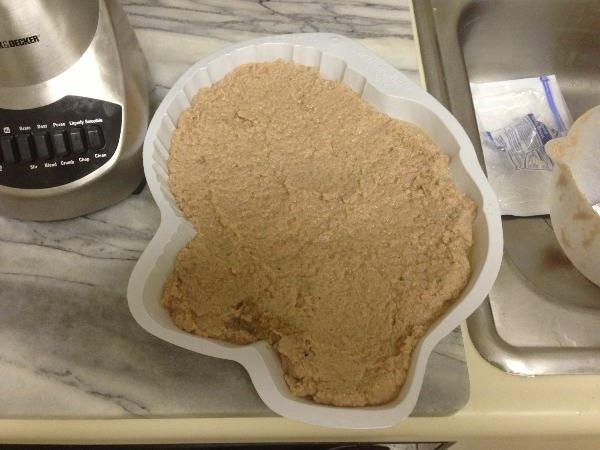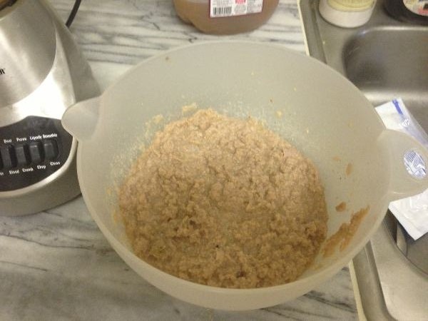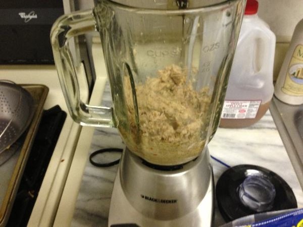 STEP 3: Bring out the blender. You knew it was coming. Just sit back and accept it; there is no going back now. Start with the Jimmy Dean turkey sausage links and the lunchmeat. Save the rest of the turkey for later! Don’t forget to pour in the cider to keep the chopping going! Feel free to use a stick to squash the poultryblob back down into the blades for finer chopping.