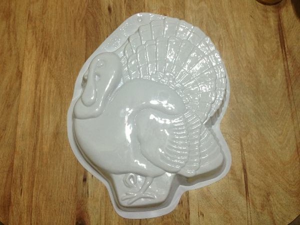 STEP 5: Begin to pour the protein batter into the pan. Make sure to fill all the crevices so it takes the shape of the turkey. Spread it around and make sure it is flat and even for the next ingredient.