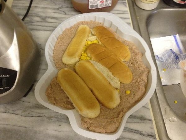 STEP 8: Remember all that extra turkey we had leftover? YEP! It’s time for the blender again! Layer the tiny smoked sausages in with the bacon and liquefy the meat.