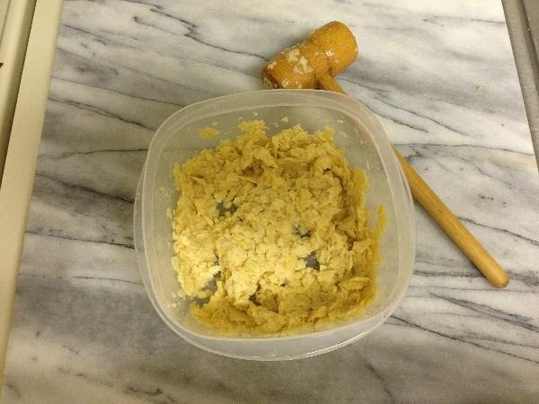 STEP 18: One more dish to go! The pie is the final dish everyone will have, so you want to make it the best they’ve ever tasted! To achieve that, I have a secret Spilly family recipe for you. I guarantee no other family has ever made this pie. We’ll start with a familiar method from our pizza recipe. Use the leftover hot dog buns to create a crust for the pie.