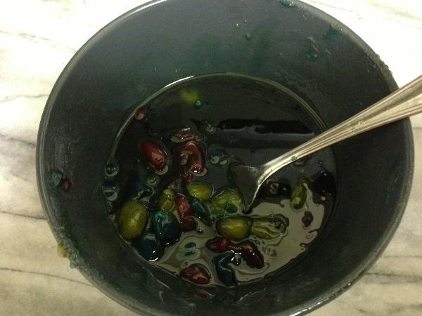 STEP 17: Once it’s mixed up, move to a bowl and MICROWAVE IT! the heat will help melt down the gushers into the syrup. You’ll see the Gushers slowly start to melt into each other, and the sauce will turn blue. That’s how you know it’s done! Set aside for later.