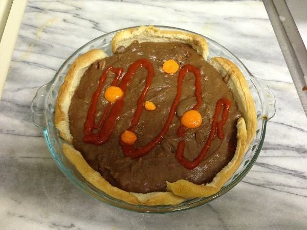STEP 25: Remove the pie is after it’s done (maybe like an hour? I dunno. What do I look like, a stopwatch?) Decorate with a festive fall pattern of Internet Paste and Tangballs!