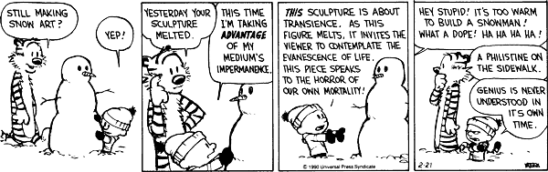 Also setting Calvin and Hobbes apart was how surprisingly literate it was, especially for a comic that was not a specific commentary piece like Doonesbury or Bloom County. Watterson admitted in the Calvin and Hobbes 10th Anniversary collection that he had held quite an interest in art for many years, and always had sort of a bemused fascination with the amount of bullshit people build around it. I'm, uh, paraphrasing, of course. Sad to say, there are many people who would find the "artwork" in these two strips to be utterly brilliant and pay a ton of cash for them. Then they'd melt. The art, that is. Or maybe the people who bought it too, hell, I dunno.