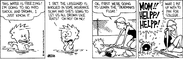 After coming home on the second or third day, I came across the first Calvin and Hobbes collection. The first page I opened to was the beginning of the story of Calvin's experience with swimming lessons. I identified with it immediately. It was incredibly spot-on. No matter how horrible my day was, I could at least take solace in the fact that my struggles were shared by someone else, even if he were a drawing. This story reminds me that I've been able to relate to "Calvin and Hobbes" more than just about anything else in the world.
