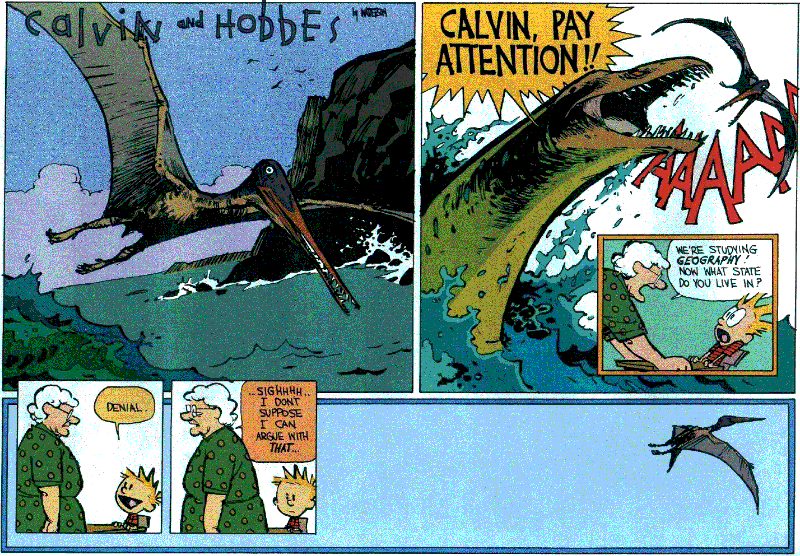 Watterson is the only newspaper cartoonist to ever convince me that he approaches his comic strip as a work of art and not just a bunch of joke boxes. He uses half the allotted space to draw Calvin as a pterodactyl, which is awesome, and the real-life storyline at the bottom being placed as an inset toward a panoramic rendering of the pterodactyl flying away is just perfect.
