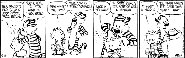 The "realistic" art style and dramatic angles of comic strip soap operas like Rex Morgan, M.D. are funny enough when they're real, so Watterson didn't have to stretch too far for a parody. I mean, look at this. I wouldn't listen to two real people talk about whether to put their kid in day care, why would anyone actually read this? Also, that second panel is scary and I think Rex is driving so fast because his passenger has to hurry and get back to The Human League.