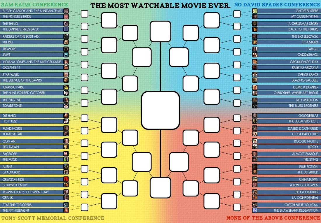 The tournament continues. Yesterday saw the launch of the first round of voting in Progressive Boink's Most Watchable Movie Ever bracket. Voting for the Sam Raimi Conference, consisting of a flung-together mix of adventure and horror films, remains open until the 5pm EST tomorrow, September 20, so make your way over to that post to cast your ballots if you haven't already. Here, again, is the complete bracket as things stand at the start of the tournament:
