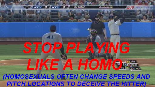 We would like to offer our sincere apologies. The game shipped before the people at 2K Sports worked out a bug that resulted in pitchers sometimes trying to "deceive" the batter by throwing pitches that curve or break in different directions. Some are even purposefully thrown completely out of the strike zone! We have dedicated ourselves to ensuring that the hitting system is made fair. Pitchers don't throw that way in real life, and they won't in our game, either. The most exciting addition we've made in this department is the ability to hit with two batters at once. Have them lean in to force a hit batter and automatically put your batters on first and second. Charge the mound and bloody the pitcher's face with the strength of two men. You can even put the same player on both sides of the plate and encourage the doppelgangers to fight to the death. Take that, slightly less evil Jason Giambi! Notice also that there are no fielders behind the pitcher. This will force the pitcher to finally play fair and do his own dirty work. The no-fielder policy applies to you when you play defense as well. This is probably for the best, since you, as a Yankee fan, likely do not possess the level of abstract thought necessary to form the reasoning that it is, in fact, best if you willfully give the baseball to someone else and therefore do not bother with relaying the ball anyway. Finally, we know you'll enjoy the smaller strike zone. After all, the pitcher's throwing a baseball, not a microwave. Call People Faggots in New and Exciting Ways From: hideki_irabu_nation@comcast.com Subject: RIDICULOUS I WOULD LIKE TO REPORT THE WORST ONLINE GAMING EXPERIENCE I HAVE EVER HAD. THIS FAGGOT CHOSE THE PIRATES AND STARTED ZACH DUKE. HE KEPT THROWING OUT OF THE STRIKE ZONE SO WHAT AM I SUPPOSED TO DO. I POLITELY ASKED HIM OVER THE MIC TO NOT BE A FAG ABOUT IT. HE WOULDN'T STOP. I TOLD HIM I WOULD CHARGE THE MOUND BUT IT WOULD NOT LET ME CHARGE THE MOUND SINCE I HAD NOT BEEN HIT BY A PITCH. AFTER SWINGING AT EVERY PITCH AND NOT HITTING ANYTHING I STARTED CRYING AND HE TOLD ME TO STOP CRYING. I THEN DISCONNECTED MY XBOX 360 CONSOLE AND THREW IT OUT THE WINDOW BUT I LIVE IN MY MOTHER'S BASEMENT SO IT IS STUCK IN THE WINDOW WELL. I AM PREPARED TO FILE CHARGES IF YOU DO NOT RESOLVE THIS MATTER.