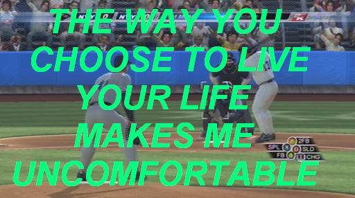 This is a very sensitive issue. Of course, we at Microsoft celebrate diversity, and that extends to sexual orientation. However, we must balance this with the need for our customers to trivialize and demean homosexuality by using it in a negative connotation. Therefore, we have decided to implement a system that allows them to do so, but it's not like anybody's going to die or anything. Below is a screenshot taken right after the player attempts to throw a pitch outside the strike zone. Repeated offenses will cause this message to appear on the pitcher's screen for the remainder of the game: Of course, as always you should feel free to scream accusations regarding orientation into the microphone as well. This allows for some well-placed strategy: do you win with good pitching and timely hitting, or will you act obnoxious enough to make the other person quit? Cheat From: jeffrey.maier@hotmail.com Subject: hi hi yes i would like to know how to cheat