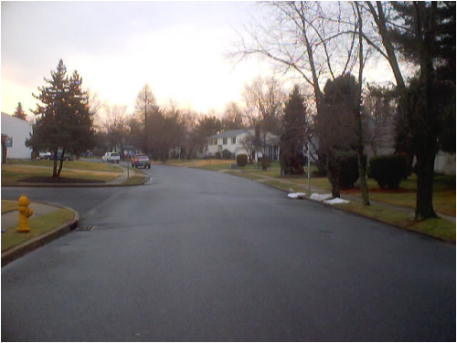 a quiet, rain-soaked suburban Jersey road on a rather warm February