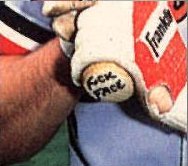 YES, the card says what you think it says... there is really no mistaking it... BILL RIPKEN'S bat says "FUCK FACE" ... and it was TOTALLY AWESOME. The poop (or SHIT as we were now free to say) hit the fan... Collectors went APESHIT for the FUCKING card that bore the curse, charging dozens and dozens of dollars for a BILL RIPKEN card never meant to leave the gated community of "common." FLEER reacted like they had just entered a dark room and flipped on the light only to find that they were now surrounded by JANET JACKSONS TITTY... The first attempt to cover the error was a blotch of white-out... that didn't work, so they tried to cover the TOTALLY AWESOME WORDS with a black box... this was even less successful....