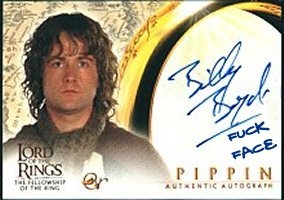 And most recently the world of fat lonely boys and excited teenage girls was rocked when DIRECTOR AND PERSONAL HERO SAINT PETER JACKSON commissioned autographed insert cards to be placed in random packs of LORD OF THE RINGS trading cards... Many of the cards were pleasant, like IAN and VIGGO... hell, ORLANDO even drew squigglies and hearts around his name... but SCOTTISH HOBBIT BILLY BOYD, the actor who plays SCOTTISH HOBBIT PIPPIN in LORD OF THE RINGS: THE FELLOWSHIP OF THE RING (or LOTR:FOTR as we abbreviate it, because it's hilarious to call it "lotter fotter") broke the cycle... inspired by BILL RIPKEN, the SCOTTISH HOBBIT LOTTER FOTTER took liberties with his signature and broke the hearts of chaste Christian girls looking for God in Good Old JRRRRRRRRRRR TOLKIEN'S EPIC TRILOGY...