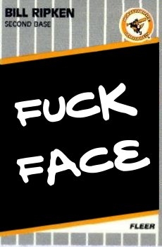 BILL RIPKEN, second baseman and little brother of superstar shortstop CAL, was posing for his 1989 FLEER BRAND BASEBALL CARD, never noticing that his teammates had scrawled something obscene on the end of his bat as a joke... He said he didn't notice until it was too late... Too late because it had passed Ripken, the photographer, and the card company... and it had shined a light into the heart of every young boy or girl who grew up under strict lock and key but dreamed of one day suggesting that they could have sex with your nose and eyes.