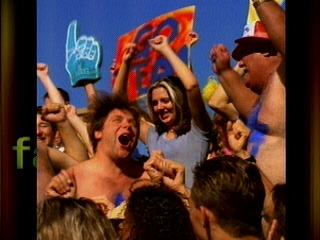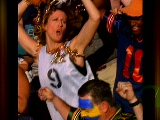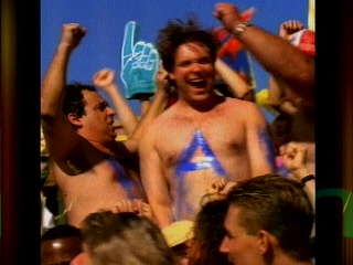 It's too perfect for words. Cal asks the tough question, and then the camera swings left and Bill Ripken Fuck Face brings it home. It's kind of like when God gave Man his Ten Commandments, and he was all "THOU SHALT NOT BEAR FALSE WITNESS AGAINST THY NEIGHBOR" and then Job was like "YEAH." The uniforms are equally classy. The Ripken boys look like they belong to a league invented by Vince McMahon, in which the final 45 feet to home plate is a Slip 'n Slide, and instead of bases there are venomous tigers chained to stakes in the ground that the player must defeat in combat before he can reach safely, and the players are encouraged to date the third-base coaches. Oh yeah, also, the fans are encouraged to be wild and crazy.