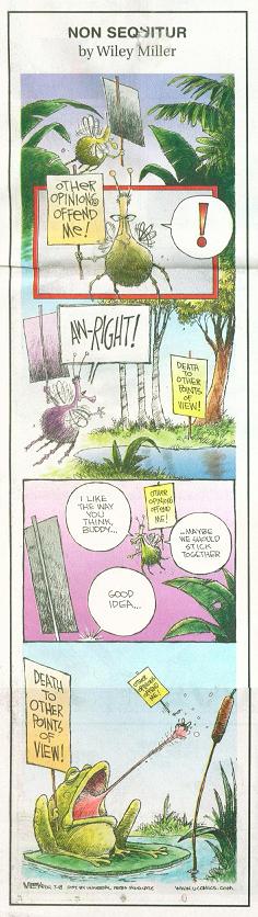 Cartoonist Wiley Miller should have left this strip on the Miller Genuine Drafting board. The strip promises to be "non sequitur", yet I am in fact able to trace a logically sound storyline and recognize the appropriateness of each element within. They should hire someone who actually knows the definition of "non sequitur".