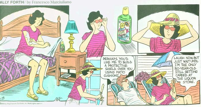That silly, stupid Sally Forth is at it again. Women are irrational and tend to engage in bizarre activities such as taking proper precautions and not getting melanoma. Her tumor-headed husband can only shake his head and laugh at his wife's silly shenanigans, which include applying sunscreen and wearing a hat. She entertains the whimsical fancy of not dying of arm cancer like Sallies First, Second and Third did. Perhaps he's just jealous of her new friend, the giant weightless floating bottle of sunscreen, who Sally can only see when she puts on her sunglasses.
