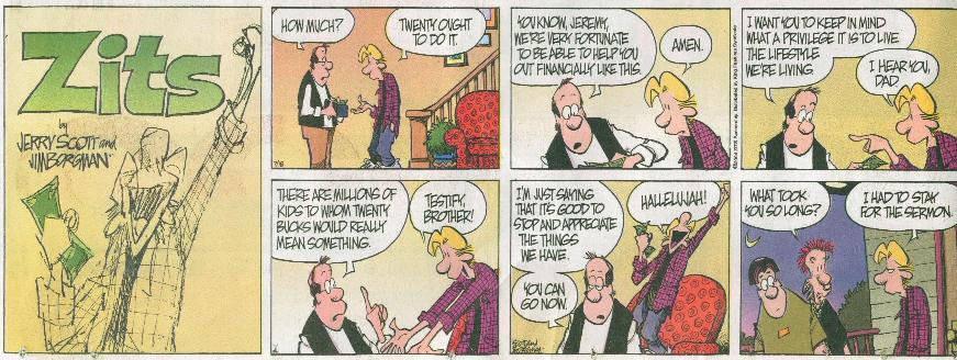 Zits is a truly monumental comic. It is the only comic to be the 493rd comic to opine that kids are retards. In fact, it has inspired me to write a sitcom, titled "IS IT NOT FUNNY THAT ADOLESCENTS ARE IN MANY WAYS DIFFERENT FROM ADULTS". Below is an excerpt from the pilot episode.