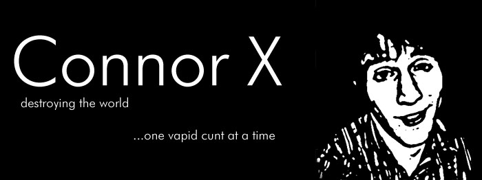 “Just an average Connor X Tuesday night,” I thought as I double-dogged two broads from behind. Whoa. Hold on. Back up a minute. Rewind. Let’s start at the beginning. Now bear in mind, I’ve got like seventy shots in my gut at this point, so I’m a little sloppy. But hey, I’m Connor X. The night’s just getting started. I started pounding beer shots. I had probably eighty mugs of beer before the barkeep said, “Whoa, fella, I think you’ve had enough.” With a wide grin spreading across my beer-encrusted face, I told him, “Enough’s enough, ‘fella’.” He toppled backwards into the shelves of beer and booze and his head fell off. Score one for the Con-man. I slammed about twenty more beerskis and…whoa. Let’s just say I was starting to feel it. “Let the games begin,” I told my boy Jakester. I scoped out the room. “Jokers to the left of me; jokers to the right. Here I am, stuck in the middle with me, myself, and I,” I thought. I scoped out one broad and the veins in her rack were busting out of their seams. I sidled up to her. “Hey, I think there’s something wrong with my receipt.” “Hm?” she asked inquisitively. “Yeah,” I yeahed. “It doesn’t have your number on it.” She laughed like a hyena and then laughed some more. I took this opportunity to pound a booze shot. I had her eating out of my hands, literally! Just then a popped-collar assbasket walked up from literally out of nowhere. “Is this guy bothering you?” he asked the broad douchely. “Not as much as your breath is bothering me, twathandle,” I deftly proclaimed. “Ladies and gentleman, boys and girls, say hello to the dog-faced boy. I don’t know whether to shake your hand or give you a pat on the muzzle.” I knew I had another burn in me before I closed the