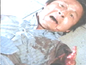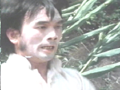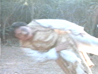 So he got his ass kicked, and all of a sudden he’s a vampire. At least I think he is, because he wakes up IN A COFFIN. And old guy feeds him soup, then The Brow, a mime, and Mr. Pow show up, beat up Lee Hoe and the old man, then stop and leave. I guess Lee got really thirsty because he decides to drink water straight from a river after the fight. Since he doesn’t have any arms, he falls in like a dork and lands on a bank somewhere. He rolls down some hill and next thing you know he’s eating pig shit in some guy’s farm. When the farmer discovers him, he tells him that he needs courage. CUT TO: cripple carrying buckets on his shoulders! There’s no better way to build up your courage than by watering some rice fields with buckets on your shoulders. And there’s no better way to get blood out of the trunk of your car than by shooting whoever finds it.