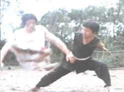 This is one of the most awkward fight scenes ever filmed: two crippled Chinese guys fighting one mean Chinese guy with a hunchback made of steel. I’ve been told that “Blind Fist Of Bruce” has the worst sound effects ever, and if that’s true, it’s got some serious ass competition, because these suck. They suck like Bibleman sucks.