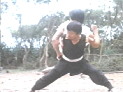 Sweet Baby Jesus. Eventually, they figure out how to actually pull this off, and when Tang’s punching ol’ dude all up in his grill, Li starts kicking him in his shins with the heels of his feet. I don’t remember how, but they kick this guy’s ass. All I remember is at one point, Tangs gets off of Li’s back and when Lin Chang Kun is bent over, he hits him in the face WITH HIS ASS!!!11 He gets hit once by Tang, then once by Li, and he falls forward to freeze frame.