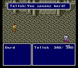 Edward also is the "prince" of Damcyan, which could really help him out as far as getting chicks goes or is possibly his "club name." Regardless, if he's actually a prince he'd better have some assless pants beneath his bard getup. As if being firebombed wasn't enough, shortly after the attack Tellah shows up demanding satisfaction. Of course Edward is completely flustered from the attack, prancing around like a goon possibly because his curtains were damaged. Tellah feels as though his demands for satisfaction have not been met, and takes it upon himself to deliver a first class ass blasting with the greatest non-Base related game translation of our time: