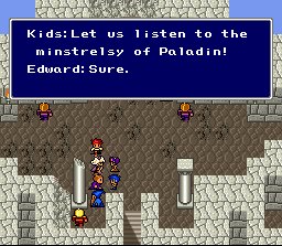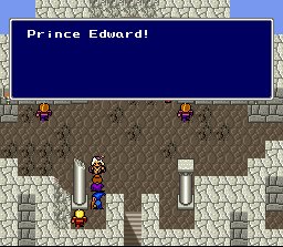 Besides being a complete wienerdog and having a useless weapon, Edward's real shining moment in the game's run is his "special attack." Most characters have a special attack that does something monumental to help out. For instance, Kain the Dragoon has a jump attack that allows him to do heavy damage to the enemy. Palom and Porom use a powerful "twin magic," ninja Edge can throw weapons, and engineer Cid can find out valuable information about the enemy (including amount of hit points remaining and weaknesses). Edward has two AWESOME attacks: