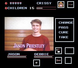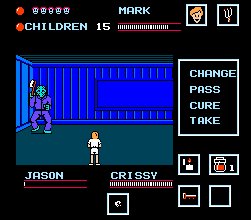 Why, killing children, of course! Although not nearly as offensive as French Maid Nude Celebrity Vaginal Banana porn, the prevention of adolescent death syndrome (being killed by Jason) is the game's modus operandi. Instead of controlling Jason himself and murdering the children (which would've been a pretty damn cool game for perverts and Pro-Choicers alike) you're forced to operate the inept bodies of Camp Blood's six most physically challenged teenage counselors. Although released in 1988, the battle system is one of the most advanced in game history, surpassing later games like Tekken and Soul Calibur with daring attacks like "run," "jump," and "throw rock."