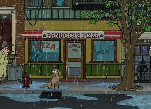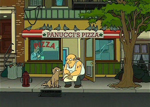 Seymour sits out front of Penucci’s Pizza, waiting for Fry to come