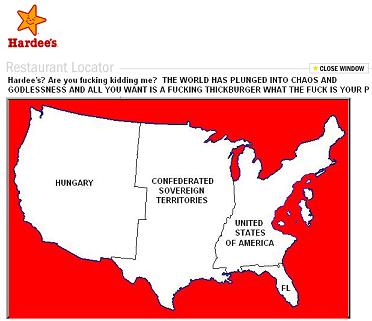 And really, it didn't matter to humanity at that time how much sense it made anyway. The majority of humankind lived underneath highway overpasses, behind dumpsters in back alleys, or if lucky, a tool shed (which, obviously, the Event left untouched). Food was disgusting if it was on the plate at all. Survival through the day was never a certainty. The "smile", once used to convey happiness or joy, was reassigned to mean, "Oh dread, a rat gnawed off my fingers while I slept." Life was bleaker than ever, and Man's primal instinct of survival was all that kept him alive. Hardees.com provided a glorious, if artificial, respite from the hellish abuse they knew as life. Of course, Internet access was inaccessible to most at the time, so the few lucky souls who did have Internet consigned their homes and computers for public use. People stood in ten-hour lines just to log on to Hardees.com and have a chance to kick their figurative feet up on the coffee table that did not really exist, watch the TV that wasn't there, and look out the window at a sky that was blue instead of a constant terrifying hue of reddish-gray.