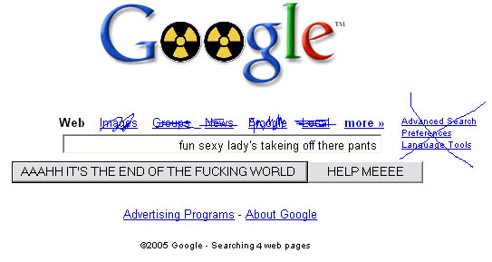 Hardee's, a pre-Event fast-food chain, was lucky enough to possess one of the very few Internet servers left unscathed. In fact, only three other websites were known to have survived: a fan-fiction site dedicated to the characters from "Field of Dreams" building a rocket ship and 'saying hi to aleins [sic]', a rather tragic LiveJournal, and, of course, Google.com. Below you see what Google looked like shortly after the Event, and far before it assumed governance of all of humanity.