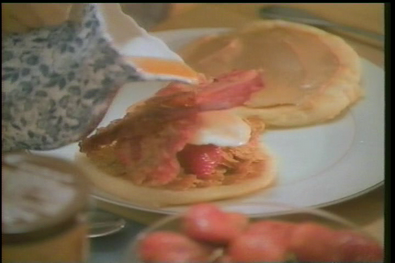 Holy shit. A pancake sandwich with Corn Flakes, strawberries, a fried egg, bacon, maple syrup and peanut butter? Are you pregnant?