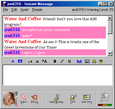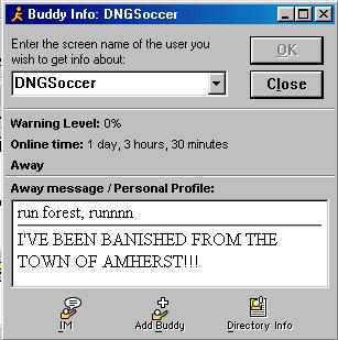 Another great thing about AIM is the ability to create a personal profile, which is viewable by all other AIM users. You can insert information about yourself, or you could abuse this space to insert song lyrics or the initials of all your friends. Also viewable in this area is the Away Message, which is a tag someone can put up if they have left the computer.