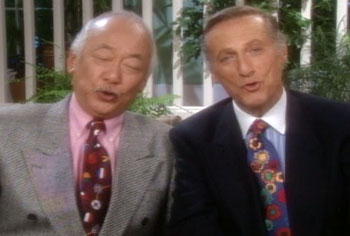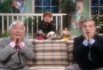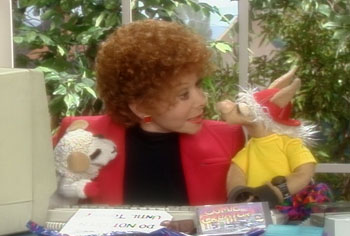 Shari's third and final special guest is the less familiar but actually Jewish Lloyd Bochner. So many Jews are in show biz, and the only one they can get to hang out with Lamb Chop is a secondary cast member from "Dynasty"? I have a feeling the writers picked the special guests using an Actors From The 1980s special edition dart board. That's the only explanation I can think of as to why Lloyd Bochner would ever be in the same place at the same time as Pat Morita.