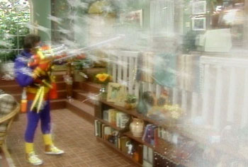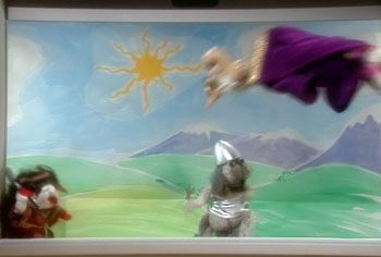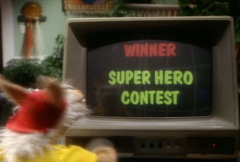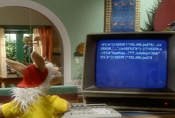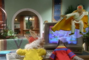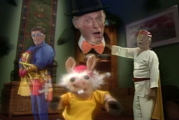 The next two to three minutes are the most awesome two to three minutes in Lamb Chop history. Using that unlikely combination of key strokes actually makes Charlie Horse's creations fly out of the monitor and materalize in his living room in cloud of the same special effects smoke your middle school used for plays. His first creation is SUPER NINJA, which looks nothing like a ninja and everything like Pat Morita in a karate gi and a cape. Since two of those three things come from Japan, the writers went with it, I guess.