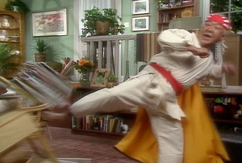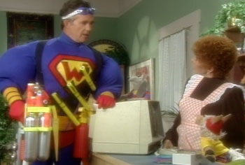 The bravest hero he can think of is Alan Thicke in Superman underoos and swimming goggles, draped in nerf arrows and Super Soakers and talking in a familiar Austrian accent. It's Weapons Man! The most daring superhero in Charlie Horse's imagination! So daring, that he's more interested in hitting on Shari in her oh, so sexy kitchen apron than do anything macho like blow up the living room.