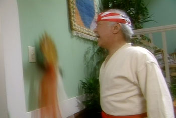 He can KARATE KICK ALL YOUR FURNITURE is what! At this point it's clear that my friend left out the precious detail about the Lamb Chop Chanukah Special, and thus so did I until now, that PAT MORITA GOES BAT SHIT INSANE in the middle of it. Look at that second photo. He's shouting at the wall and a coat hanger falls over. Charlie Horse has created a karate man who can YELL YOU TO DEATH. He would've taken a whole plate full of latkes from Lamb Chop and destroyed the rest of the house by breathing thumbtacks if Charlie Horse hadn't hit the Delete key on his computer and sent Super Ninja swirling back into the monitor, all while classily telling him "Saionara."