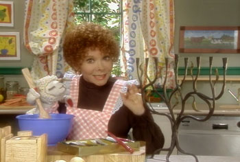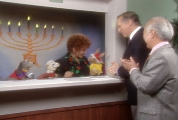 After Lamb Chop raises her head like an overly eager schoolgirl just to give us the doyyyy answer, Shari goes into the symbolism involving the reclaiming of the Hebrew temple and the eight-day Miracle of the Oil, which Lamb Chop prefaces by explaining that the "Serious People" captured the Jewish temple and REALLY ruined it! I'm sure most good little Jewish boys and girls knew that just as well as they know what a menorah is, but she told a short version of the whole thing, anyway. Just in case you thought the Miracle of the Oil happened during the 1985 Stanley Cup playoffs or something, I guess.