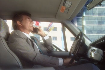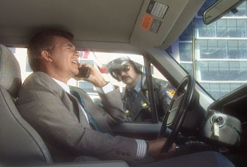 Man, they really enforce those cell phone laws. What's wrong with needing to make a phone call in a stand-still traffic jam? Why, being the first car in the jam, of course. Traffic cleared up in the ten minutes it apparently takes Alan Thicke to remember what numbers are and dial a cell phone. Alan doesn't own breasts, so he tries to get out of the ticket using his star power, but since both "Growing Pains" and the "Not Quite Human" trilogy ended three years ago, all the cop does in response to the name "Alan Thicke" is hopes he feels better. I hate it when cops are good at ice burns.