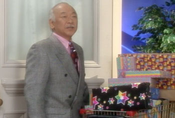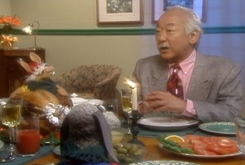 Pat Morita is in the Lamb Chop Chanukah special. As himself. Or at least a version of himself that owns the sort of primary blue shirt I have only ever seen in children's entertainment. He asks Shari, who is carrying three large bags of groceries, if he can give her a hand. "Yes, please," she replies with a hint of urgency in her voice.