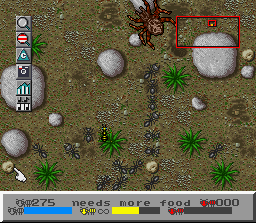 In SimAnt, you take control of one particularly industrious member of the colony, and help your group to grow and prosper by leading them to food, avoiding predators, and attacking other colonies. The game is divided up into two modes. In Scenario mode, you play through eight missions that take place over the course of a year, starting with expansion and growth in early spring and ending with food gathering and hording in the fall in preperation for winter. In Full mode, the goal is to take over The Stupidest Man In The World's lovely Bel Air estate.